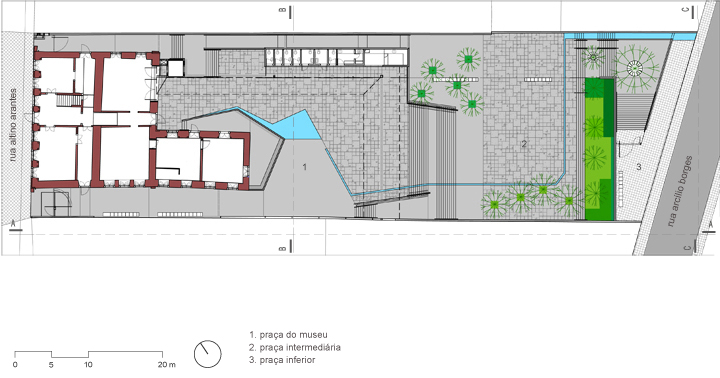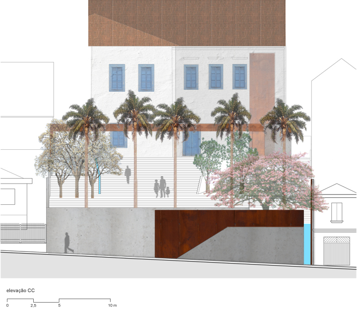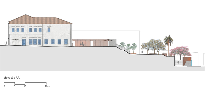 Landscape architecture project for the external areas of a 19th century listed building in Porto Feliz – Brazil, as part of its restoration and conversion into the Museu das Monções museum. The reconfiguration of the open spaces around the mansion sought to create a pedestrian connection between the two adjacent streets, while capitalising on the difference in street levels. Wide steps double function as seats and gradually elevate the visitor’s gaze, unveiling views to the historic building as one approaches.
